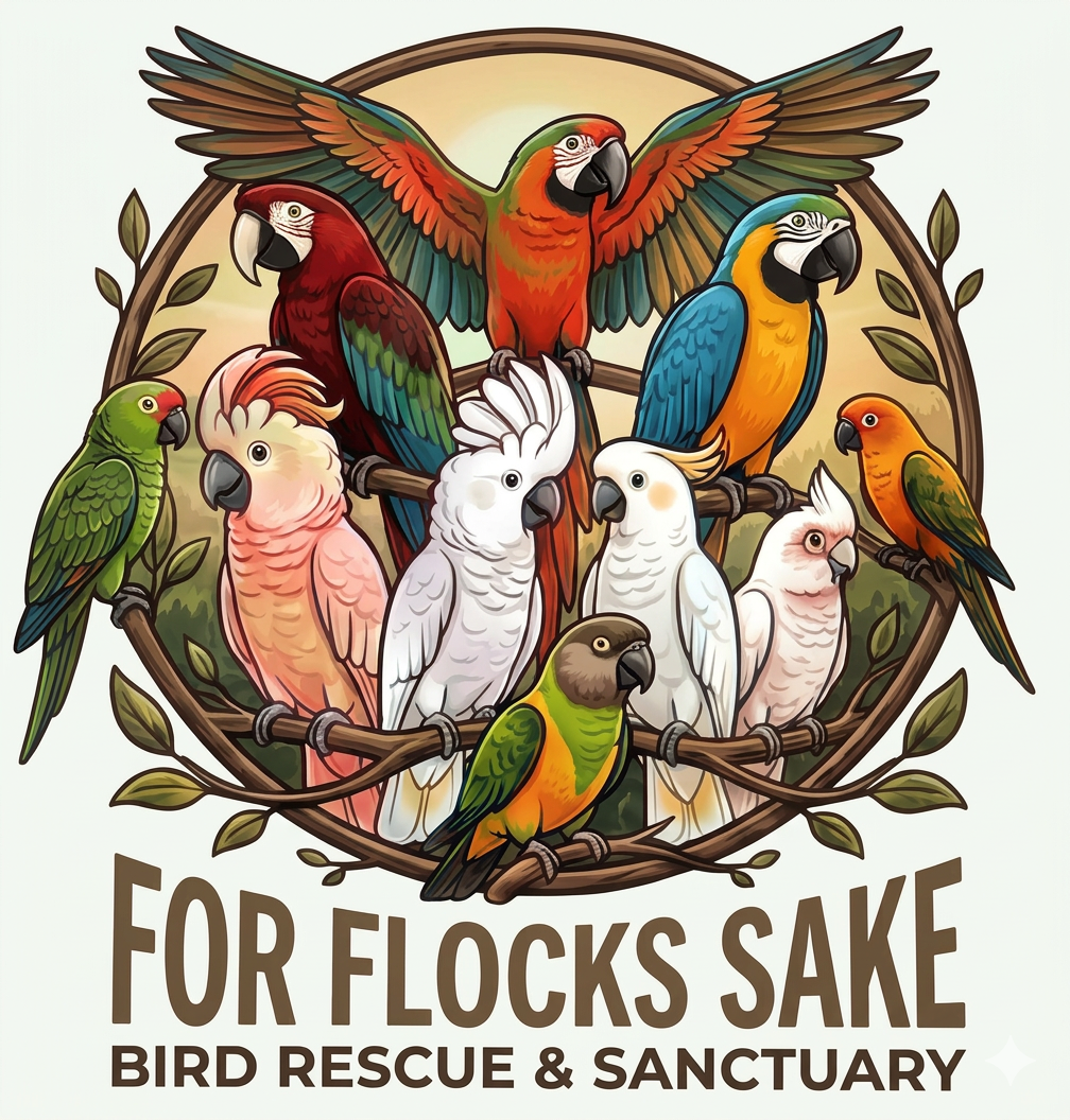 For Flocks Sake Bird Rescue & Sanctuary officially began 2/27/26 but it’s makings were in progress even before that. Monica Hebert has a passion for birds and for giving them the best lives possible. After she and her husband began their bird journey with a little Sun Conure named Maria, the flock quickly grew. Their personal birds now include Marco, another Sun Conure, Charlotte, a Lesser Sulfur Crested Cockatoo, Amenadiel, a Catalina Macaw, Millie, an Umbrella Cockatoo, Dracarus, a Red-Lored Amazon hand fed from a baby, and the newest addition Flora, a Parakeet.
