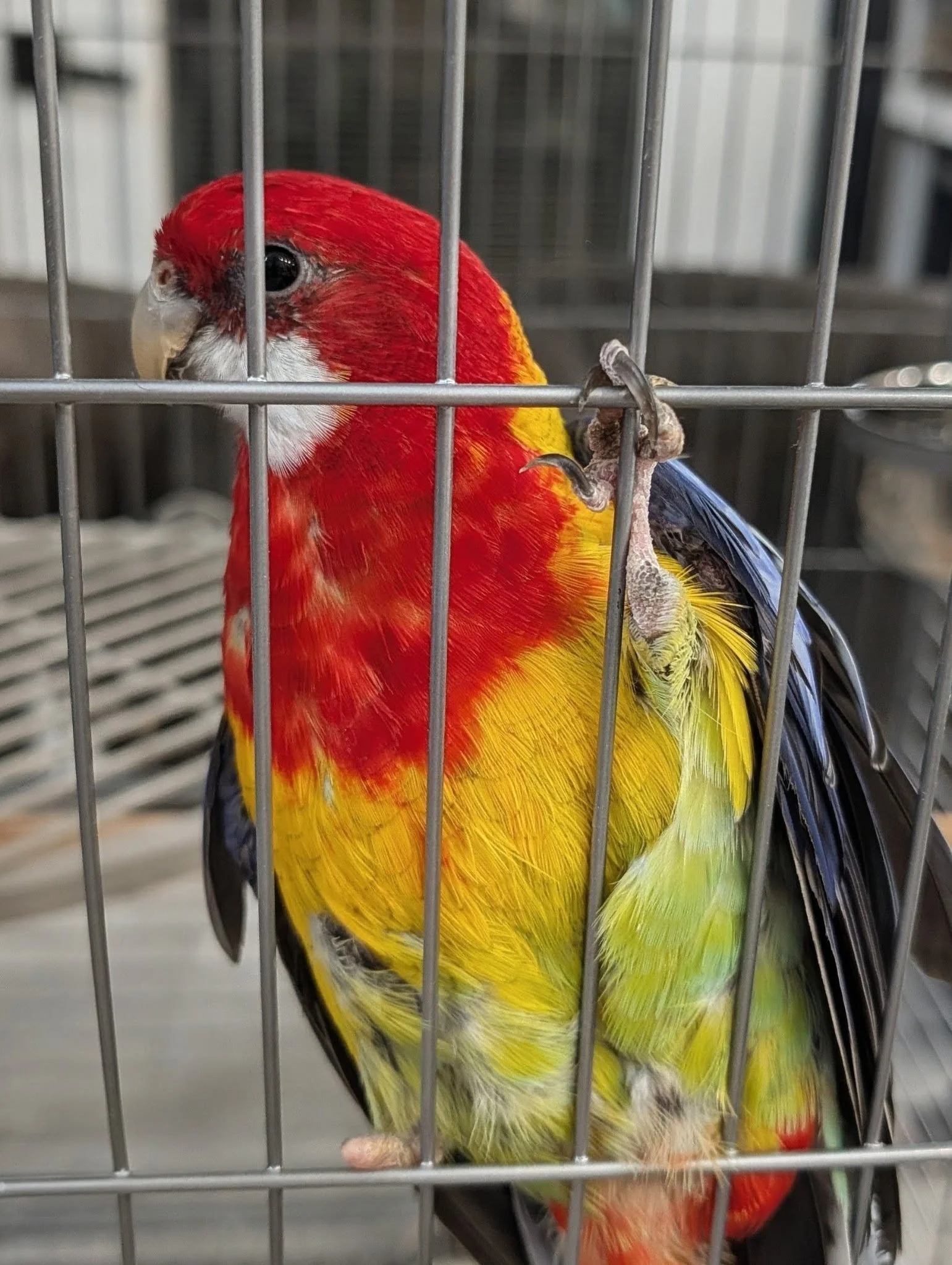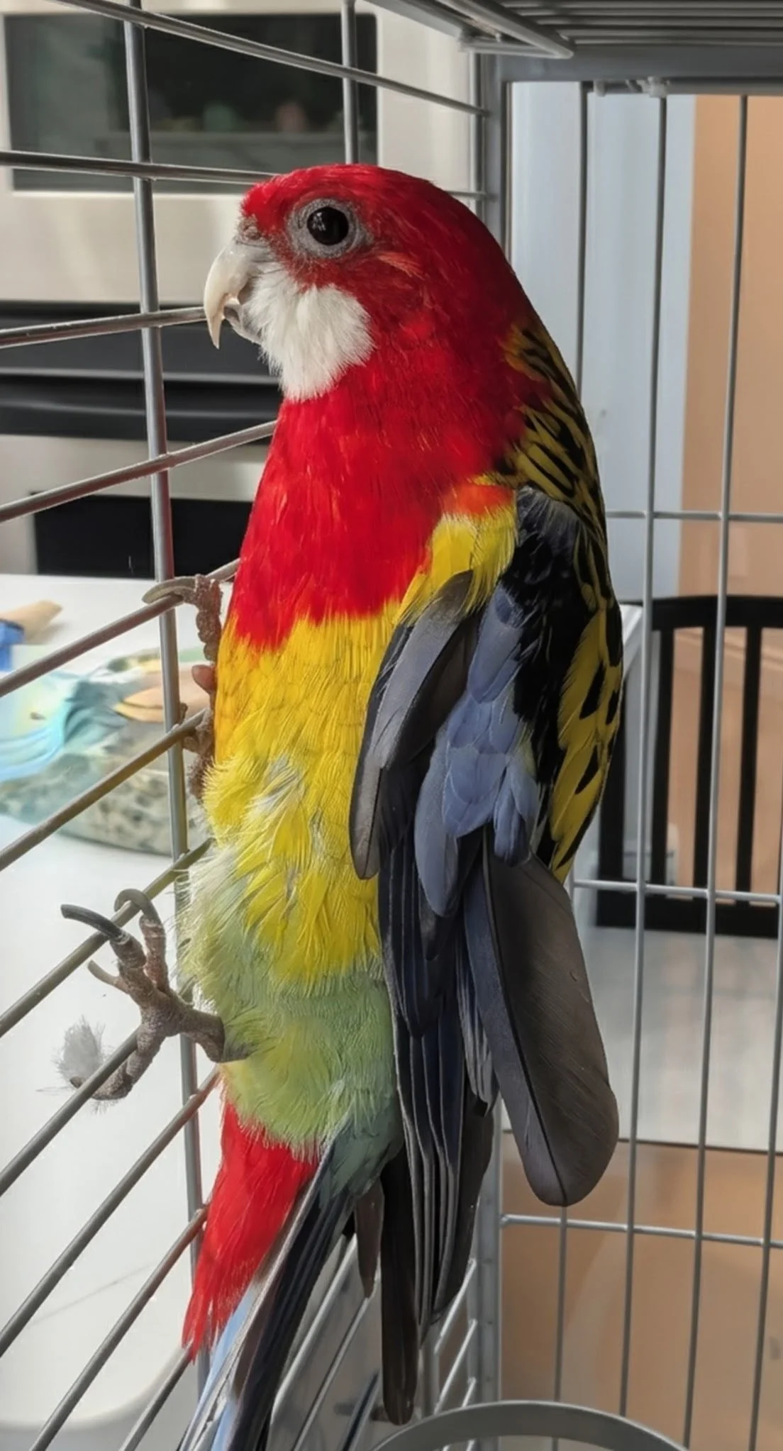 This awesome boy came to us on 3/10/26 at the approximate age of 18 years. He’s quite the whistler and can whistle the Andy Griffith theme song as well as The Addams Family. Other than the whistling he’s pretty quiet. Rosellas aren’t known, however, for their cuddly nature so if you’re looking for a snuggle buddy, he’s not it, but they are beautiful to look at and have in the room with you.